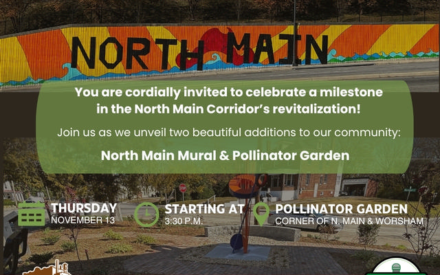 The event will begin at 3:30 p.m. at the Pollinator Garden on the corner of North Main Street and Worsham Street. After unveiling and exploring the garden, attendees will walk down to unveil the highly anticipated North Main Mural at the gateway entrance to the corridor at Riverside Drive and North Main Street. A shuttle will also be available for guests needing transportation between the two locations.